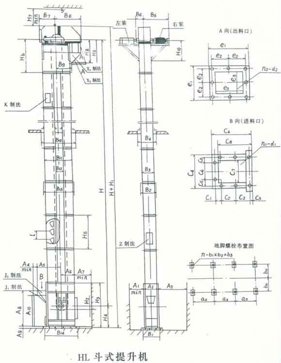 我公司生產(chǎn)的HL 型環(huán)鏈離心斗式提升機(jī),由運(yùn)動(dòng)部分(料斗與牽引鏈條)、帶有傳動(dòng)鏈輪的上部區(qū)段、帶有拉緊輪的下部區(qū)段、中間機(jī)殼、驅(qū)動(dòng)裝置、逆止制動(dòng)裝置等組成(見下 圖)。本提升機(jī)的料斗為間斷式布置,利用“掏取法”進(jìn)行裝載,“離心投料法”卸料。本提升機(jī)的牽引機(jī)構(gòu)是兩根環(huán)形鏈條.我公司生產(chǎn)的HL型環(huán)鏈離心斗式提升機(jī),由運(yùn)動(dòng)部分(料斗與牽引鏈條)、帶有傳動(dòng)鏈輪的上部區(qū)段、帶有拉緊輪的下部區(qū)段、中間機(jī)殼、驅(qū)動(dòng)裝置、逆止制動(dòng)裝置等組成(見下圖)。本提升機(jī)的料 斗為間斷式布置,利用“掏取法”進(jìn)行裝載,“離心投料法”卸料。本提升機(jī)的牽引機(jī)構(gòu)是兩根環(huán)形鏈條。